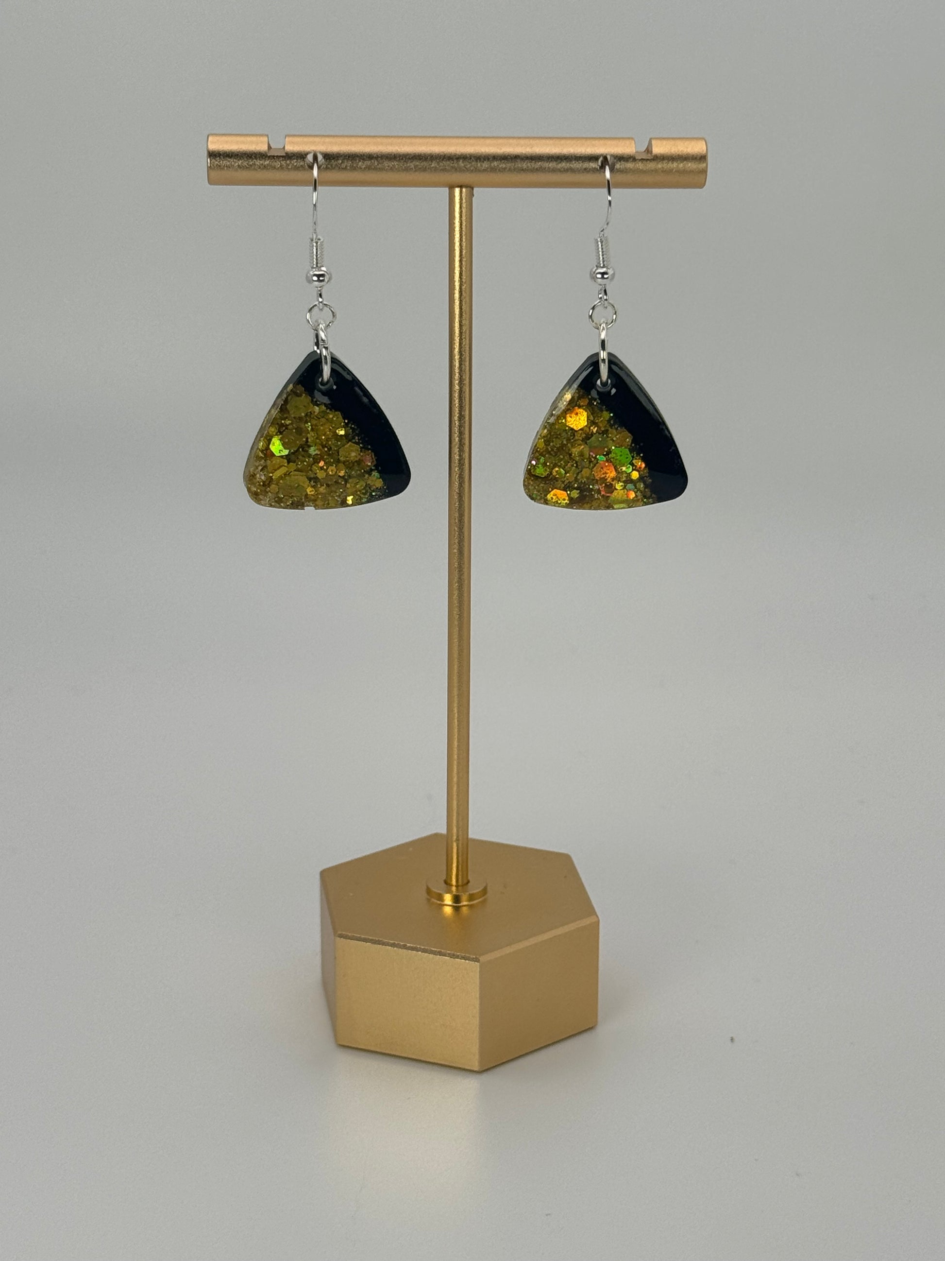 Color: Silver finish. Yellow glitter with black resin.