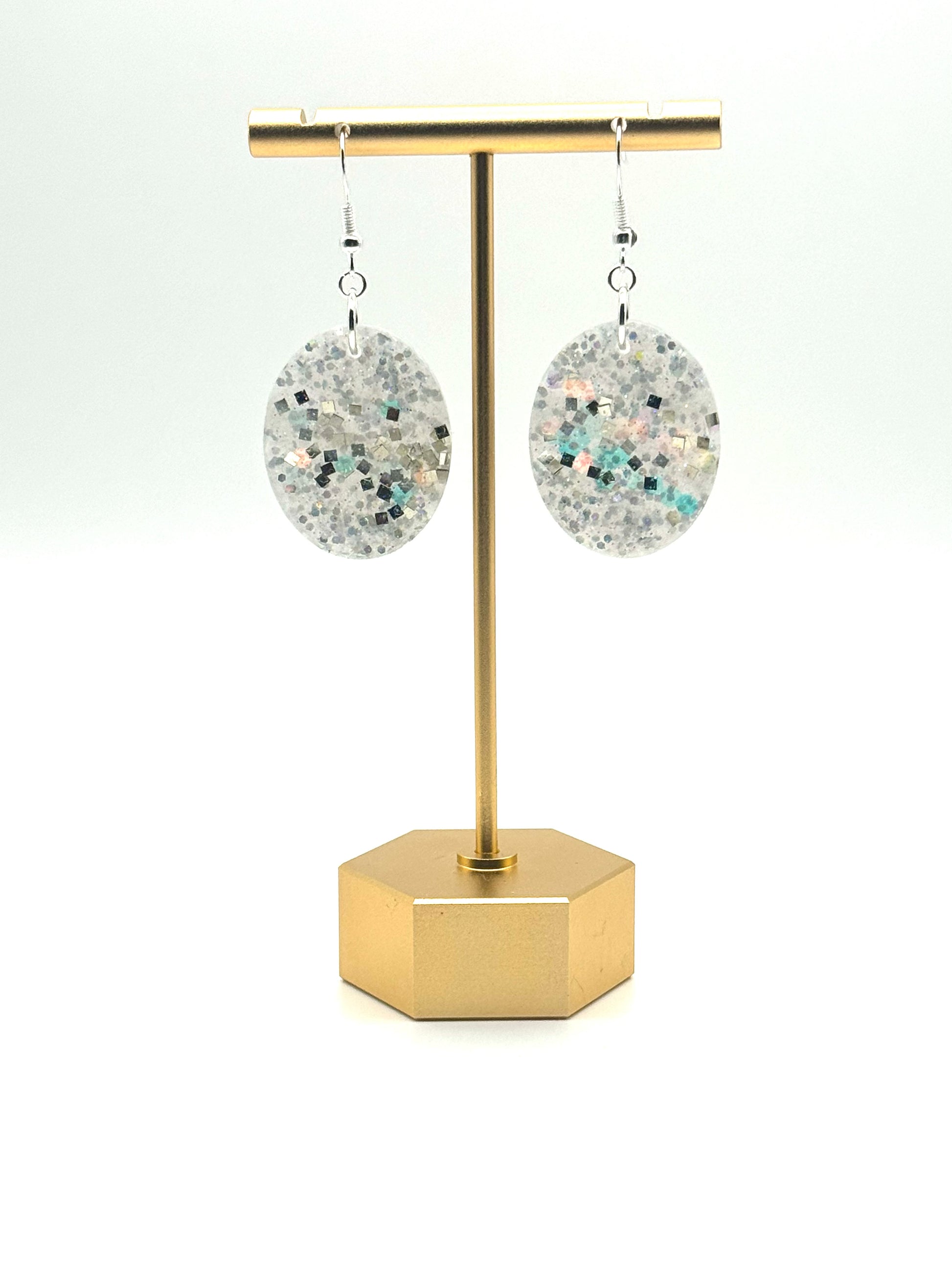 Color: Silver finish. Shades of white glitter resin.