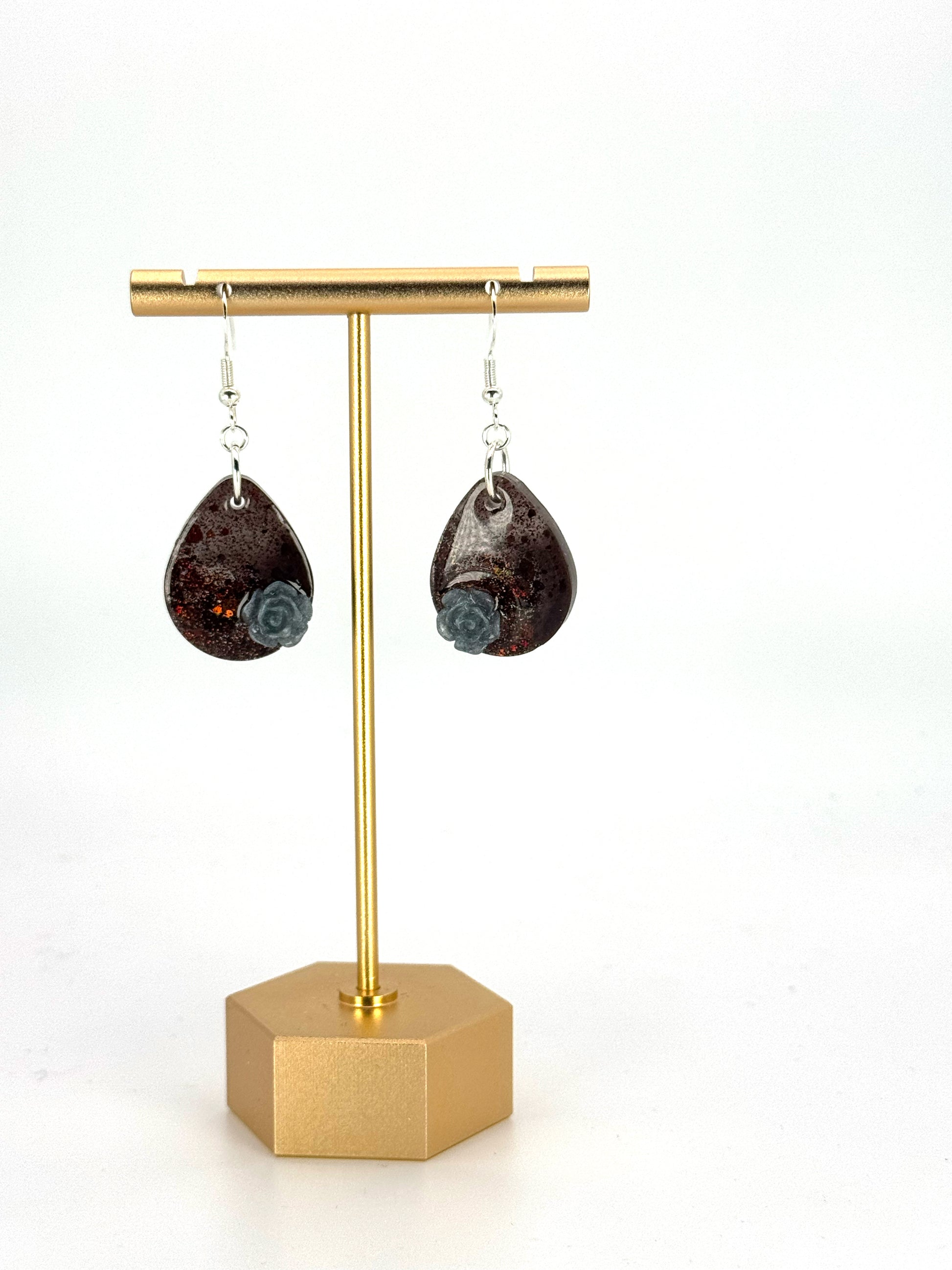 Color: Silver finish. Brown glitter with blue resin rose.